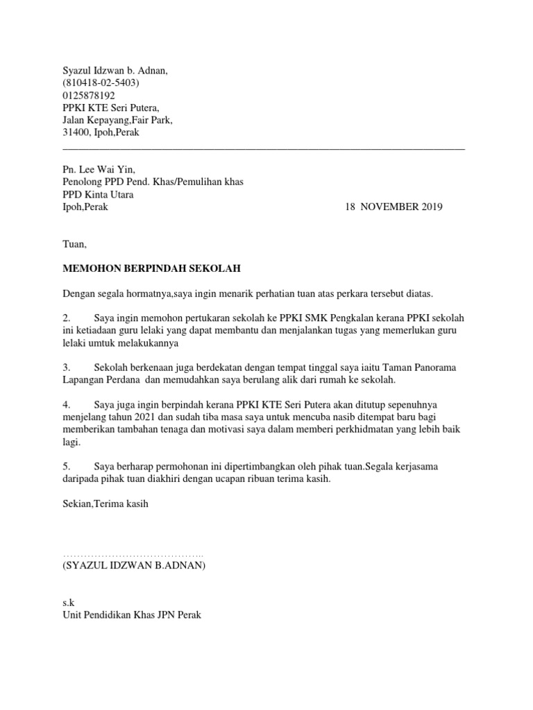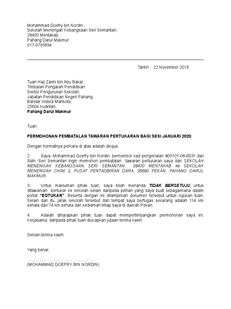 Terima kasih berkongsi prosedur pertukaran sekolah. Contoh surat rayuan pertukaran egtukar cikguhailmi via. Contoh karangan surat rasmi.